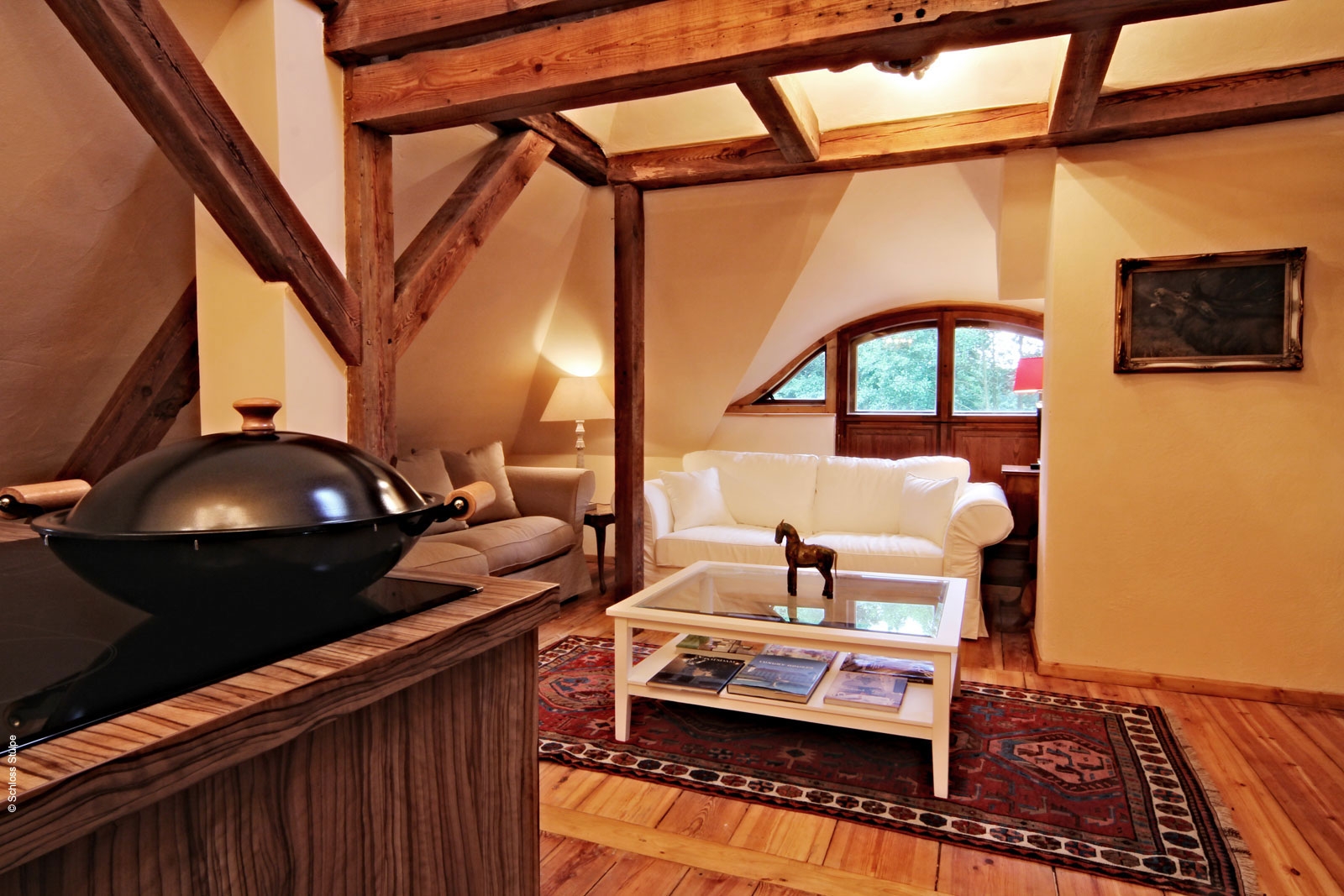 Live under old uncovered roof beams. Has a modern kitchen island (induction cooker). Separate bedroom. Jacuzzi for 2 persons, shower and bidet. 1 bed in the lounge. View of the manor, horse meadows and the old forge.