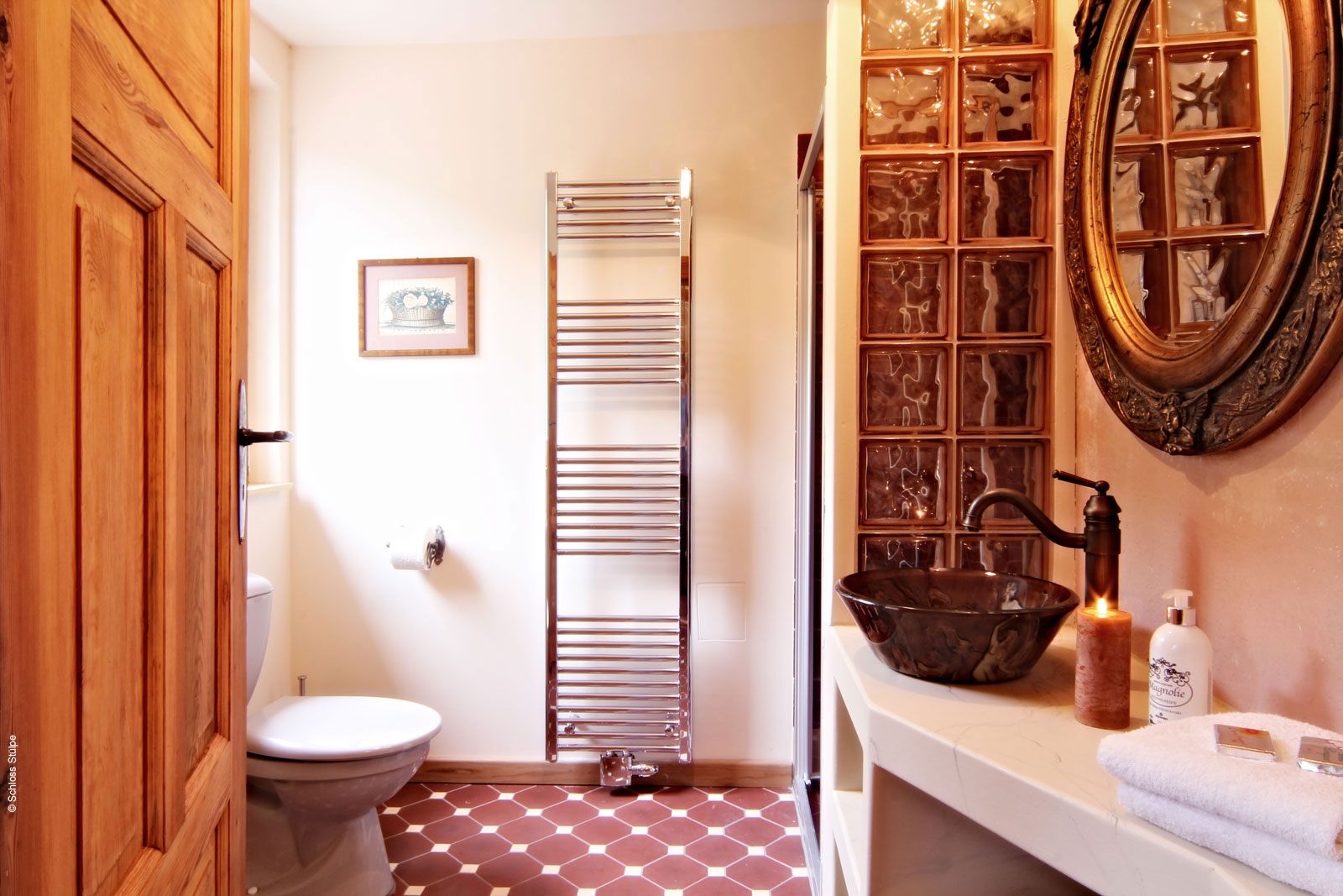 Schlafzimmer aus den 30er Jahren mit großem Doppelbett (2,1 x 2,3 m2), Arbeitsraum, separatem Duschbad und Blick auf die anliegenden Pferdeweiden.